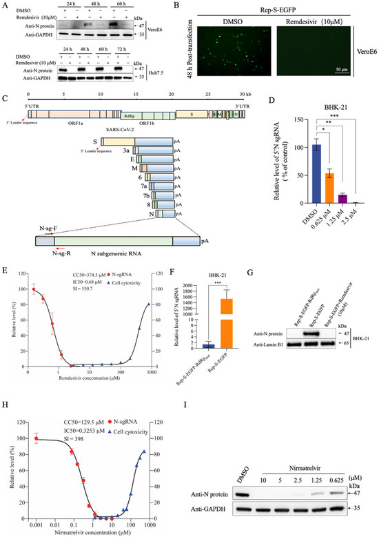 Rep-S-EGFP replication in transfected cells. (A) Changes in nucleocapsid (N) protein levels in Rep-S-EGFP-transfected cells and the effect of remdesivir on its expression. The Rep-S-EGFP replicon plasmid was transfected into VeroE6 and Huh7.5 cells. After 6 h, 10 μM remdesivir was added. Cell lysates were collected at 24, 48, 60, and 72 h post-transfection for western blotting analysis. (B) At 48 h post-transfection, VeroE6 cells as depicted in (A) were imaged under a fluorescence microscope. Representative images from three independent experiments are shown. (C) Schematic representation of qRT-PCR primers N-sg-F and N-sg-R targeting N gene sgRNAs. The replication of SARS-CoV-2 generates numerous subgenomic RNAs, as indicated in the diagram. (D) Rep-S-EGFP replicon-transfected BHK-21 cells were treated with remdesivir at indicated concentrations for 36 h. N gene sgRNA was quantified using qRT-RCR with specific primers. Each group included 3 biological replicates. * indicates p < 0.05, ** indicates p < 0.01, *** indicates p < 0.001. (E) The Rep-S-EGFP replicon plasmid-transfected BHK-21 cells were treated with different concentrations of remdesivir for 36 h. N sgRNA was determined as depicted in (D). Cytotoxicity was evaluated using the CCK-8 assay. Cells mock-treated with DMSO were used as control. Selectivity index (value of CC50/IC50, SI). (F) Differential expression of progeny N sgRNAs between the replicons Rep-S-EGFP and Rep-S-EGFP-RdRpmut. Data were normalized to the Rep-S-EGFP-RdRpmut control. *** indicates p < 0.001. (G) Comparison of N protein levels in Rep-S-EGFP- or Rep-S-EGFP-RdRpmut-transfected BHK-21 cells. Treated with remdesivir for 36 h after transfection for 6 h. Cell samples were collected and analyzed using western blotting. (H) Rep-S-EGFP replicon-transfected BHK-21 cells were treated with nirmatrelvir at indicated concentrations for 36 h. The inhibitory effect and cytotoxicity of nirmatrelvir on Rep-S-EGFP were investigated as depicted in (E). (I) The N protein expression in nirmatrelvir-treated cells, as described in (H), was determined using western blotting.
