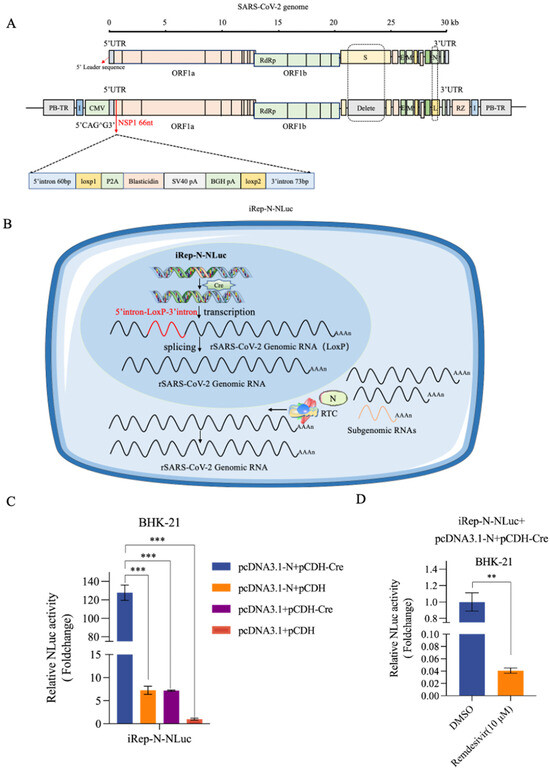 An inducible SARS-CoV-2 replicon system co-transfected with N-protein rescued viral replication upon Cre/loxP-mediated site-specific recombination. (A) Structure of the recombinant SARS-CoV-2 replicon (iRep-N-NLuc). A transcription stop cassette integrated between nt 66 and 67 (i.e., CAG66^G67; ^ indicates the potential exon/exon boundary) of the NSP1 gene. The inserted sequence consists of the indicated elements in order. PiggyBac 5′ TR and chicken β-globin insulators are inserted at the 5′ end of the CMV promoter and at the 3′ end of the HDV RZ region, respectively, flanking the transcription unit. “L” stands for NLuc. (B) A schema of the intracellular process of inducible iRep-N-NLuc replication in the cell model. In the absence of Cre recombinase, the CMV promoter only drives the expression of the blasticidin resistance gene, preventing SARS-CoV-2 replication, facilitating the selection of stably integrated cell lines. Following Cre recombinase induction in replicon cell lines, site-specific recombination removes the transcription stop cassette at the DNA level. The CMV promoter then initiates transcription of the viral genome. RNA splicing mechanisms within the nucleus eliminate the remaining single LoxP site. The cell nucleus is depicted in blue, while the cytoplasm is shown in light blue. (C) BHK-21 cells were co-transfected with the iRep-N-NLuc replicon and indicated plasmids plus a Renilla luciferase normalization plasmid. The fold change in NLuc activity was normalized to that of the Renilla luciferase activity. *** indicates p < 0.001. (D) BHK-21 cells were co-transfected with iRep-N-NLuc replicon, pCDNA3.1-N, and pCDH-Cre. At 6 h after transfection, cells were treated with 10 μM remdesivir for an additional 24 h and subjected to analysis of NLuc activity. Cells mock-treated with DMSO were used as a control. ** indicates p < 0.01.