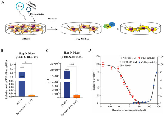 Generation of an inducible stable cell line producing a recombinant SARS-CoV-2 replicon. (A) Schematic illustration of the procedure to generate a cell-based SARS-CoV-2 replicon model. (B,C) The iRep-N-NLuc cell line was transfected with a bicistronic IRES vector (pCDH-N-IRES-Cre). Cells were either treated with 10 μM remdesivir or mock treated with DMSO. The recombinant N-NLuc sgRNAs (B) and NLuc activity (C) were determined at 24 h post-transfection. Error bars indicate the mean ± SEM from three independent experiments. ** indicates p < 0.01, **** indicates p < 0.0001. (D) pCDH-N-IRES-Cre-transfected iRep-N-NLuc cells were treated with different concentrations of remdesivir for 24 h. NLuc activity was determined. Cytotoxicity was evaluated using the CCK-8 assay. Data were expressed as the percentage of the mock-treated controls. Error bars indicate the mean ± SEM from three independent experiments.