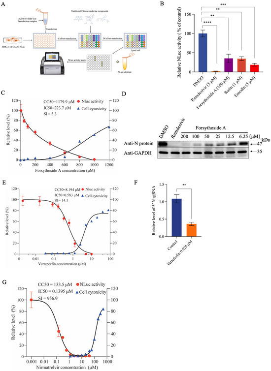 Antiviral drug screening and validation based on the inducible SARS-CoV-2 replicon cell model. (A) Schematic illustration of the procedure for antiviral screening based on the iRep-N-NLuc cells model. (B) Evaluation of the antiviral activity of candidate compounds in the iRep-N-NLuc-cells model. Cells were transfected with pCDH-N-IRES-Cre and treated with candidate compounds at indicated doses. The NLuc activity was determined at 24 h post-transfection and were expressed as a percentage of the values measured in DMSO-treated cells. Error bars indicate the mean ± SEM from three independent experiments. ** indicates p < 0.01, *** indicates p < 0.001, **** indicates p < 0.0001. (C) iRep-N-NLuc cells were transfected with pCDH-N-IRES-Cre, followed by the treatment with forsythiaside A at indicated doses for 24 h. NLuc activity was determined as depicted in (B). Cell viability was measured using the CCK-8 assay. (D) BHK-21 cells were transfected with Rep-S-EGFP and treated with forsythiaside A at indicated doses. After 48 h, N protein expression was determined using western blotting. (E) Rep-N-NLuc-transfected cells were treated with varying concentrations of verteporfin for 24 h. NLuc activity was measured and expressed as a percentage of the values measured in mock-treated cells. Cell cytotoxicity and CC50 were assessed using the CCK-8 assay. (F) Rep-S-GFP-transfected cells were treated with verteporfin for 36 h. N sgRNA was determined using qRT-PCR. Data are presented as the mean ± SEM from three independent experiments. ** indicates p < 0.01. (G) iRep-N-NLuc cells were transfected with pCDH-N-IRES-Cre for 6 h and subsequently treated with varying concentrations of nirmatrelvir. NLuc activity was determined as depicted in (B). The cytotoxicity assay is the same as the CCK8 assay in Figure 2G.