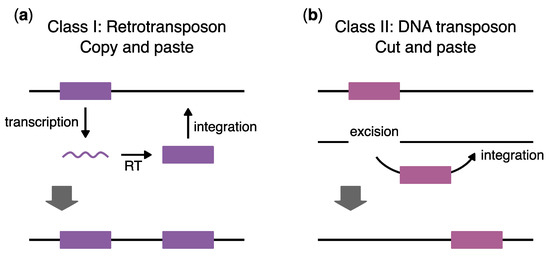 There are two major classes of transposons, Class I Retrotransposon and Class II DNA transposons, which differ in their mechanism of movement (Figure 1). Class I Retrotransposons move using a “copy and paste” mechanism [4,9] (Figure 1a). In this process, the host machinery transcribes the transposon insertions to produce an RNA intermediate. In autonomous elements, the resulting transcripts encode a reverse transcriptase, which converts the RNA transcript into a DNA copy, and an integrase, which inserts the DNA copy into a new genomic location. This “copy and paste” mechanism results in the duplication of the original transposon at a novel site [9].