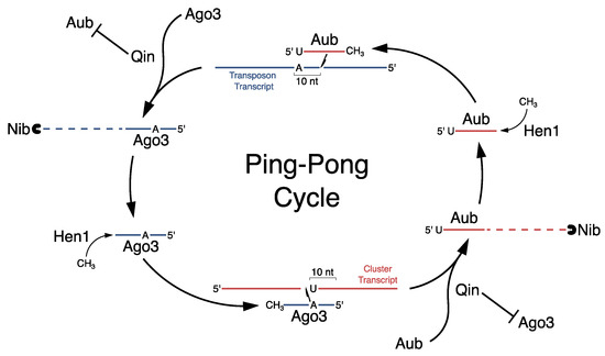 After cluster transcripts are exported from the nucleus, two pathways drive piRNA biogenesis. The Ping-Pong cycle amplifies the piRNA pool (Figure 2c), and phased biogenesis increases piRNA sequence diversity (Figure 2d). Most of the proteins required for Ping-Pong biogenesis localize to perinuclear granules known as nuage, including the DEAD box RNA-binding protein Vasa; the PIWI clade Argonautes Aub and Ago3; and Tudor domain-containing proteins like Krimper, Kumo, and Qin [64,97,98,99]. In the Ping-Pong cycle, Aub, loaded with initiator piRNAs derived from cluster transcripts, cleaves complementary sense-strand transposon transcripts, leading to post-transcriptional silencing (Figure 3). This also generates a 5′ cleavage product that is bound by Ago3, forming the precursor of the responder piRNA. Subsequent trimming of the 3ʹ end by the exonuclease Nibbler and methylation by Hen1 creates a mature “sense” piRNA [100,101]. The loaded Ago3 can then become the new initiator piRNA and target cluster transcripts for cleavage and subsequent loading into Aub. Again, trimming and methylation by Nibbler and Hen1, respectively, drive the maturation of the responder piRNA. Aub, loaded with anti-sense piRNAs, continues the cycle [64,102].