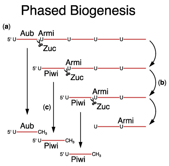 Piwi is the founding member of the PIWI clade Argonaute proteins and is the third and final member found in D. melanogaster [51]. Piwi is loaded with trail piRNAs through the phased biogenesis pathway, which is initiated when an Ago3-cleaved cluster transcript is loaded onto Aub, producing a long precursor bound to Aub [106,111] (Figure 4a). Armi, an RNA binding ATPase, localizes at nuage and mitochondria and is proposed to shuttle Aub-bound precursors from the nuage to the mitochondria [111]. The mitochondrial endonuclease Zucchini cleaves the Aub complex from the precursor. Trimming then generates a mature Aub–piRNA complex. Zucchini cleavage generates fragments with a 5′ uridine, which is bound by Piwi to form the precursor for the next trail piRNA [106,111,112,113] (Figure 4b). Subsequent cycles of Zucchini cleavage, 3′ trimming, and methylation produce head-to-tail arrays of mature piRNAs bound to Piwi (Figure 4c). Processive processing through the phased biogenesis pathway is proposed to diversify the piRNA pool, while the Ping-Pong cycle drives piRNA amplification.