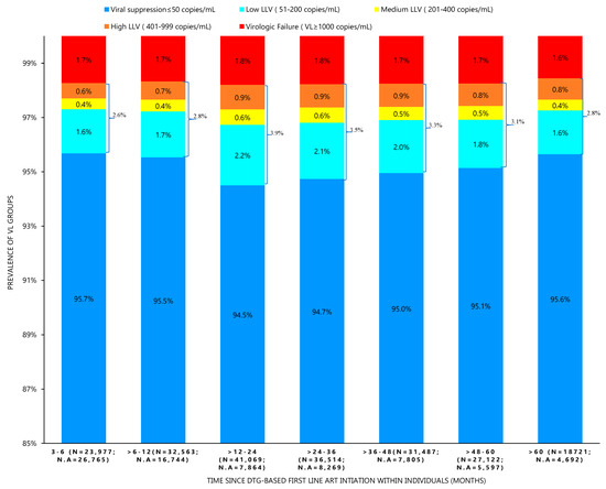 We firstly analyzed the prevalence of virologic response categories (e.g., viral suppression [VL ≤ 50 copies/mL], LLV and VF among available VL measurements within each stratum of time since DTG-based first-line ART initiation within individuals. Time since DTG-based first-line ART initiation within an individual was classified into 7 categories: 3–6 months; >6–12 months; >12–24 months; >24–36 months; >36–48 months; >48–60 months; and >60 months. Individuals with multiple VL measurements were classified in the range of the highest VL group result when falling in the same duration strata for the calculation of VL group prevalence.