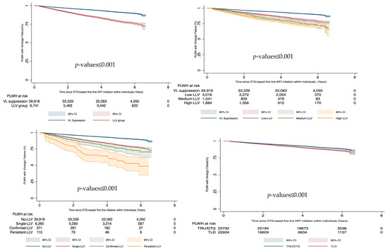 The following supporting information can be downloaded at: https://www.mdpi.com/article/10.3390/v16050720/s1, Table S1: Low survival probability was reported in low level viremia compared to virally suppressed, high-LLV against low-LLV and persistent-LLV compared to a single instance of LLV.
