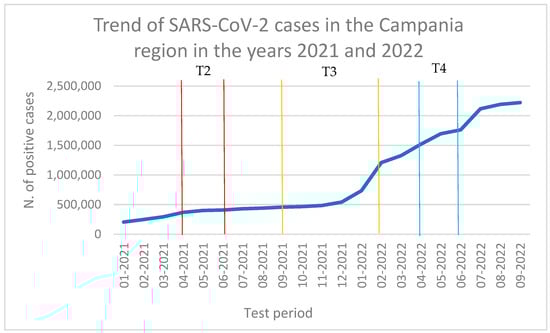 Trend of SARS-CoV-2 cases in the Campania region in the years 2021 and 2022 (data obtained from ISS report).
