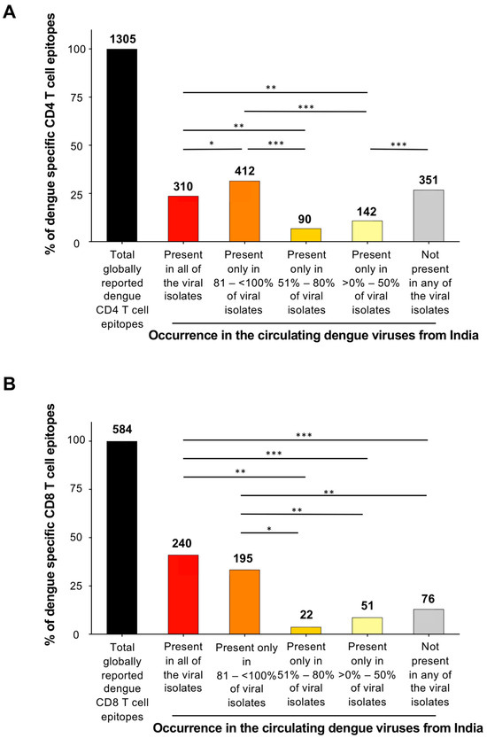 Inspection of the globally reported dengue-specific CD4 and CD8 T cell epitopes for their presence or absence in circulating dengue viruses from India. Bar graphs show the percentages of globally reported dengue-specific (A) CD4 T cell epitopes and (B) CD8 T cell epitopes in circulating dengue virus isolates from India. In both A and B, the proportion of these epitopes not present in any of the viral isolates; epitopes present in all of the viral isolates; epitopes present in 81 –< 100%; in 51–80%; or in only >0–50% of viral isolates are shown relative to the total epitopes. Numbers of the epitopes present in each category are shown on top of the bars. The significance values associated with the proportions of epitopes in each category are indicated in the coordinates as inset. Significance was calculated by χ2 test. The p values are indicated as * p ≤ 0.05; ** p ≤ 0.01; and *** p ≤ 0.001. Detailed information on each of the individual epitopes is shown in Table S3.