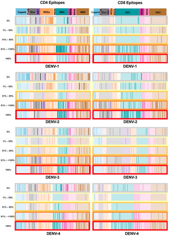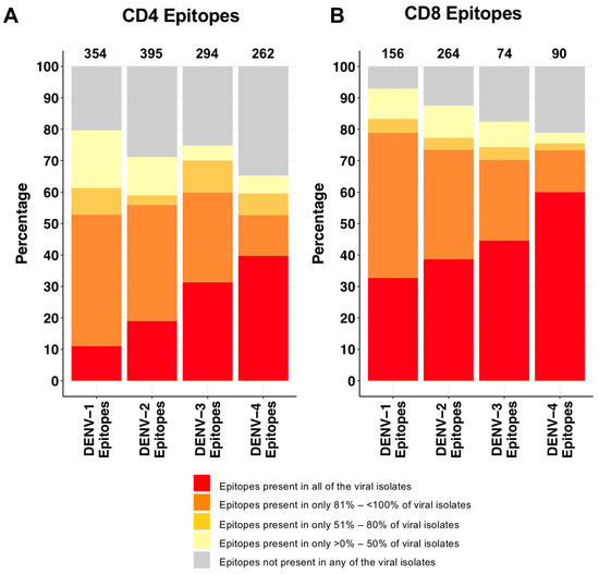 We then segregated the globally reported T cell epitopes into eight separate categories, DENV-1-, DENV-2-, DENV-3- and DENV-4-specific CD4 and CD8 T cell epitopes. Each serotype-specific epitope sequence was then aligned with circulating viral sequences corresponding to that particular serotype in each geographical region. After the alignment query, an epitope was considered to be present if the epitope aligned with 100% identity. if not, then it was considered absent. The epitope was categorized based on the proportion of viral sequences in which it was identified, with the following bins established—for all viral isolates (100%), for 81 –< 100%, for 51–80%, for <0–50%, and for those absent in any of the viral isolates.
