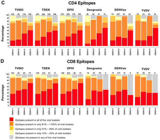 Summary of the distribution of the globally reported dengue-specific global CD4 and CD8 T cell epitopes in individual dengue vaccine candidates and in the circulating dengue viruses from India. Bar graphs show the number of globally reported DENV-1-, DENV-2-, DENV-3- or DENV-4-specific (A) CD4 T cell epitopes and (B) CD8 T cell epitopes in each of the six indicated dengue vaccine candidate constructs. Distribution of the (C) CD4 T cell epitopes and (D) CD8 T cell epitopes carried by each of the vaccines among circulating dengue viruses from India. In both (C,D), numbers on the top of each bar represent the number of epitopes found in the indicated vaccine and for the indicated serotype. Stacked bars show percentages of these epitopes in different categories, as described in the legend.
