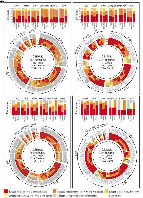 Hence, in this study we first focused on addressing this question by compiling known dengue-specific CD8 and CD4 T cell epitopes worldwide [10,11,13,15,20,26,27,28,29,30,31,32,33,34,35,36,37,38,39,40,41,42,43,44,45,46,47,48,49,50,51,52,53,54,55,56,57,58,59,60,61,62,63,64,65,66,67,68,69,70,71,72,73,74,75,76,77] and aligning these with 107 published full-length polyprotein sequences of dengue virus isolates available from India. Of the experimentally validated globally reported dengue-specific 1305 CD4 and 584 CD8 epitopes compiled, we found 24% and 41%, respectively, were conserved universally, whereas 17% and 13% were absent in any viral isolates from India. Concurrently, by aligning these epitopes with the six dengue vaccines under consideration (TV003, TDEN, DPIV, CYD-TDV, DENVax and TVDV), we catalogued epitopes conserved in circulating dengue viruses from India and also matched with each of the six vaccine candidates.