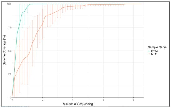ASFV time-course sequencing using fresh whole-blood samples from pigs experimentally infected with ASFV Georgia 2007/1 (ET41) or ASFV Lisbon/60 (ET34). Each sample was extracted in triplicate, and libraries were prepared from each replicate. Shown is the % of the coverage of the ASFV genome. Data are plotted with 95th percentiles for all three replicates for each of the two pigs tested.