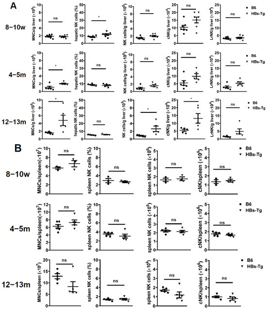 The number of cNK cells, but not LrNK cells, was significantly increased in the livers of 12- to 13-month-old HBs-Tg mice. MNCs were isolated from the livers and spleens of 8- to 10-week-old, 4- to 5-month-old and 12- to 13-month-old HBs-Tg mice and the control WT B6 mice, and then analyzed by flow cytometry. (A) The numbers of hepatic MNCs, and percentages and numbers of hepatic total NK cells (CD3−NK1.1+). The hepatic total NK cells (CD3−NK1.1+) were further gated to analyze the percentages of LrNK (CD3−NK1.1+CD49b−CD49a+) and cNK (CD3−NK1.1+CD49b+CD49a−) cells. The absolute number of LrNK and cNK cells were calculated. (B) The numbers of splenic MNCs, and percentages and numbers of splenic total NK cells (CD3−NK1.1+). The splenic total NK cells (CD3−NK1.1+) were further gated to analyze the percentages of cNK cells (CD3−NK1.1+CD49b+CD49a−). The data are shown as the mean ± SEM. Student’s t test was used. No significant statistical difference is defined as ns. * p < 0.05.