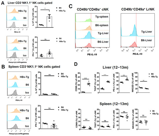 Interestingly, the intrahepatic NK cells showed a stronger ability to produce IL-10 in the 12- to 13-month-old HBs-Tg mice when compared with the control B6 mice (Figure 2A), but not the splenic NK cells (Figure 2B). No differences in IFN-γ production were observed (Figure 2A,B). Furthermore, the intrahepatic cNK cells showed higher expression levels of IL-10 than the splenic cNK cells in the HBs-Tg mice, and the LrNK cells did not exhibit the ability to produce IL-10 in the HBs-Tg mice, which were the same as in the control B6 mice (Figure 2C). These results indicate that the intrahepatic cNK cells, but not the LrNK cells, account for IL-10 production in aged HBs-Tg mice. Furthermore, these intrahepatic cNK cells showed higher expression levels of CD69, TIGIT and PD-L1, and lower expression levels of NKG2D in the aged HBs-Tg mice compared with the control B6 mice (Figure 2D), but no significant differences were observed in the splenic cNK cells between the HBs-Tg mice and control B6 mice (Figure 2D). The phenotype changes in the cNK cells were not observed in the liver and spleen of the adult HBs-Tg mice (8- to 10-week old) or the control B6 mice (Figure S2). These results indicate that hepatic cNK cells are skewed to produce IL-10 and exhibit immune inhibitory features with the ageing of HBs-Tg mice.