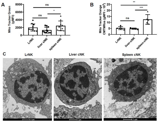 Mitochondrial morphology and function of LrNK, hepatic and splenic cNK cells from HBs-Tg mice. MNCs were isolated from the livers and spleens of 4- to 5-month-old HBs-Tg mice, and then analyzed by flow cytometry. (A) Mass of mitochondria determined by MitoTracker® Green FM. (B) Membrane potential of mitochondria determined by MitoTracker® Orange CMTMRos. (C) Electron microscopic morphology of LrNK, hepatic cNK and splenic cNK cells of 12- to 13-month-old HBs-Tg mice. Ultraslices (50–70 nm) of the cell samples were observed under a transmission electron microscope. The representative ultrastructure is shown. The data are shown as the mean ± SEM. A one-way ANOVA test was used. No significant statistical difference is defined as ns. * p < 0.05, ** p < 0.01, *** p < 0.001.