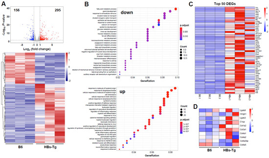 Differentially expressed genes in hepatocytes of HBs-Tg mice compared with WT B6 mice. Hepatocytes were isolated from 4-month-old HBs-Tg mice and control B6 mice, and then analyzed through mRNA sequencing. (A) The Volcano plots, based on the fold change and p value, show the differential expression of the indicated genes. The two vertical lines correspond to a two-fold change in the expression. The horizontal line indicates p = 0.05. The red plots represent the upregulated genes. The blue plots represent the downregulated genes. (B) GO enrichment analysis of the DEGs. Biological pathways for downregulated DEGs and upregulated DEGs are shown, respectively. (C) Top-50 DEGs are shown. (D) Representative DEGs associated with cell adhesion are shown.