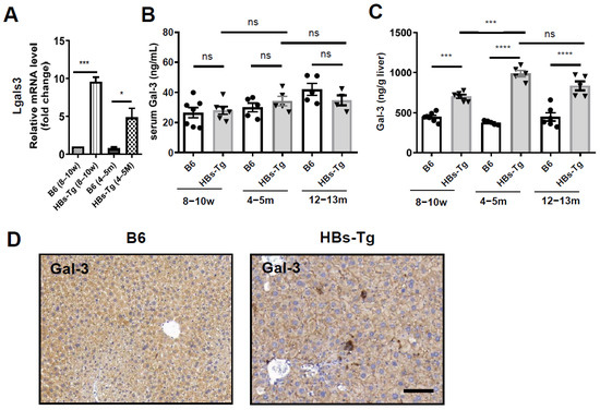 High expression levels of Galectin-3 in HBsAg+ hepatocytes. Liver and serum samples were collected from 8- to 10-week-old, 4- to 5-month-old and 12- to 13-month-old HBs-Tg mice and control WT B6 mice, respectively. (A) mRNA expression levels of Lgals3 in livers were detected by quantitative real-time PCR. (B) Serum levels of galectin-3 (Gal-3) protein detected by ELISA. (C) Levels of Gal-3 protein in liver tissues detected by ELISA by using liver homogenate. (D) Liver samples were collected from 4- to 5-month-old HBs-Tg mice and control WT B6 mice for Gal-3 staining by IHC. Dark-brown dots represent positive staining. Bar = 100 μm. Data are shown as the mean ± SEM. One-way ANOVA test was used. No significant statistical difference is defined as ns. * p < 0.05, *** p < 0.001, **** p < 0.0001.