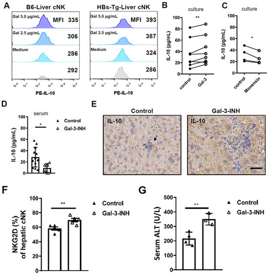 Further, we assessed the role of Gal-3 by in vivo experiments using a Gal-3 inhibitor (TD139) treatment. The inhibition of Gal-3 significantly decreased the serum levels of IL-10 in the HBs-Tg mice (Figure 6D). In the livers of the HBs-Tg mice, IL-10-positive cells could be detected, but in the livers of the TD139-treated HBs-Tg mice, no IL-10-positive cells were observed (Figure 6E), which further confirms the induction of IL-10 secretion by Gal-3. In the livers of the TD139-treated HBs-Tg mice, cNK cells were found to express higher levels of the activating receptor NKG2D, indicating that high levels of Gal-3 in the liver inhibited their activation (Figure 6F). Accordingly, hepatocyte injury was induced when Gal-3 was inhibited, as demonstrated by the increased serum levels of ALT in the TD139-treated HBs-Tg mice (Figure 6G).