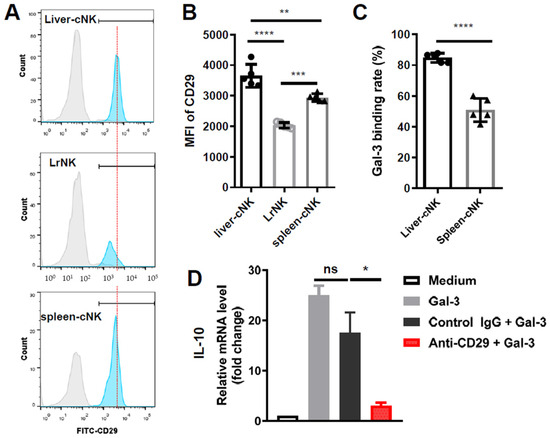 Extracellular Gal-3 can interact with several kinds of receptors with glycoconjugates on their cell surfaces to mediate cell signaling, such as CD107a, lymphocyte-activation gene-3 (LAG-3) and integrin subunit beta 1 (ITGB1). Here, we found low expression levels of CD107a and LAG-3 (Figure S4A,B), but high expression levels of ITGB1 (CD29) in the hepatic cNK cells in the HBs-Tg mice (Figure S4C), indicating the possibility of an interaction between Gal-3 and CD29. As shown in Figure 7A,B, in the HBs-Tg mice, the hepatic cNK cells express much higher levels of CD29 compared with the splenic cNK cells and LrNK cells. Correspondingly, a higher Gal-3 binding rate with hepatic cNK cells than splenic cNK cells is confirmed (Figure 7C). Further, whether Gal-3 induces IL-10 production in hepatic cNK cells through CD29 was determined. Gal-3 strongly induced IL-10 transcription (>20-fold) in the hepatic cNK cells after 48 h of stimulation, as detected by a real-time PCR (Figure 7D). Treatment with a neutralizing antibody against ITGB1 (anti-CD29) dramatically inhibited IL-10 transcription (Figure 7D). Gal-3 did not affect the cytotoxicity of the cNK cells against tumor target cells (Figure S5). These results demonstrate that Gal-3 induced IL-10 production in the hepatic cNK cells via ITGB1 signaling in the HBs-Tg mice.