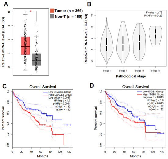LGALS3 and ITGB1 expression correlated with poor progression and survival of LIHC patients. Gene Expression Profiling Interactive Analysis (GEPIA2) was used to perform analysis for given sets of TCGA expression data. (A) Box plots of LGALS3 gene expression in liver hepatocellular carcinoma (LIHC). TCGA normal and GTEx data were matched. Log2 (TPM + 1) was used for log-scale. * p < 0.05. (B) Pathological stage plots of LGALS3 gene expression in LIHC. Use major stages for plotting. Log2 (TPM + 1) was used for log-scale. (C) Overall survival analysis of LIHC patients stratified by LGALS3 gene. (D) Overall survival analysis of LIHC patients stratified by ITGB1 gene. Median group cutoff was used. Hazards ratio was calculated based on Cox PH Model; 95% confidence interval (CI) was added as a dotted line.