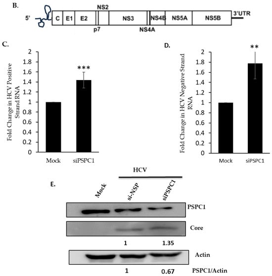 Localization of PSPC1 and its effect on HCV-JFH1 RNA transfection. (A) Huh7.5 cells were transfected with HCV-JFH1 RNA followed by immunofluorescence. Alexa Fluor conjugated secondary antibodies against PSPC1 (Red) and NS5B (Green) were used for detection. The nucleus was counterstained with DAPI. (B) A representative image of HCV JFH1 RNA (adapted from Matsui et al. J Virol. 2012) [31]. (C) Huh7.5 cells were transfected with siNsp and siPSPC1, and after 24 h transfection, HCV-JFH1 RNA was transfected; at 48 h post-transfection, cells were harvested for RNA isolation and Western blotting. A positive strand of HCV RNA was detected via qRT-PCR upon siPSPC1. (D) A negative strand of HCV RNA was detected upon siPSPC1 treatment using qRT-PCR. (E) Western blot analysis showing the effect of the silencing of PSPC1 (** p < 0.01; *** p < 0.001).