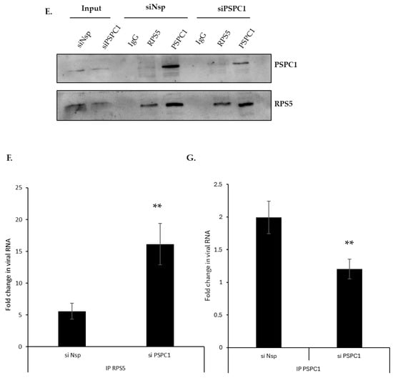 Binding of PSPC1 with different stem loops of HCV 5’ UTR and competition with RPS5. (A) A schematic representation of the HCV IRES showing interaction with RPS5 and ribosome loading. (B) UV-crosslinking assay with α-32P-labeled full-length 5’UTR of HCV RNA alone or in the presence of the indicated molar excess (50× and 100×) of unlabeled stem–loop RNAs of HCV 5’ UTR. (C) Densitometry of UV crosslinking experiment from (B) represented in graphical format. (D) Competition UV cross-linking of HCV IRES and PSPC1 in the presence of rRPS5 (lane 1–4). Competition UV cross-linking of HCV IRES and RPS5 in the presence of rPSPC1 (lane 5–8). (E) Western blot showing PSPC1 and RPS5 protein after HCV-JFH1 RNA transfection in Huh7.5 cells, followed by immunoprecipitation using anti-PSPC1 antibody, anti-RPS5 antibody, or IgG isotype antibody (as a negative control) in the presence of siPSPC1 or siNsp. (F) qRT-PCR data showing fold change in viral RNA upon immune-precipitation with anti-RPS5 antibody. (G) Fold change in viral RNA using qRT-PCR upon immune precipitation with anti-PSPC1 antibody. (* p ≤ 0.05, ** p < 0.01).