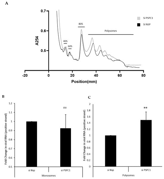 Huh7.5 cells were transfected with siNsp or siPSPC1 RNA. After 16 h of transfection, they were transfected with HCV-JFH1 RNA. At 48 h post-transfection, the cells were treated with cycloheximide (100 µg/mL) for 10 min at 37 °C. Subsequently, the cells were washed with ice-cold phosphate-buffered saline (PBS) containing cycloheximide, followed by a wash with hypotonic buffer [5 mM Tris-HCl (pH 7.5), 1.5 mM KCl, 5 mM MgCl2, and 100 µg/mL cycloheximide]. Cells were then scraped in ice-cold lysis buffer [5 mM Tris-HCl (pH 7.5), 1.5 mM KCl, 5 mM MgCl2, 100 µg/mL cycloheximide, 1 mM dithiothreitol (DTT), 200 U/mL RNasin, 200 µg/mL tRNA, 0.5% Triton X-100, 0.5% sodium deoxycholate, and 1X protease inhibitor cocktail] and incubated on ice for 15 min. Following incubation, a final concentration of 150 mM of potassium chloride (KCl) was added to the lysate. After centrifuging the lysate at 3000× g for 8 min at 4 °C, the supernatant was collected and can either be processed right away or flash-frozen and kept for later use at −80 °C. Then, 1.0–1.5 μg of total protein was loaded onto a 10–50% sucrose gradient and centrifuged at 36,000 rpm for 2 h at 4 °C in SW41 rotor (Beckman, California, USA). A polysome profiler (BioComp, New Brunswick, Canada) was used to visualize polysome profiles and collect fractions. Individual fractions were then used to separate monosomes and polysomes, and RNA was isolated for RT-PCR. The final data were normalized with a housekeeping gene GAPDH and further normalized with the amount of input RNA present in each condition to nullify the possible effect of an overall increase in polysomes due to the silencing of PSPC1.
