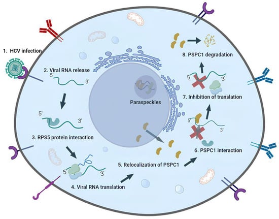 Model illustrating PSPC1, a paraspeckle protein, in the life cycle of HCV. Upon entry into the cell through receptor-mediated endocytosis, HCV undergoes uncoating, releasing its positive-strand RNA genome into the cytoplasm for translation. Translational initiation of HCV RNA occurs via its internal ribosome entry site (IRES). RPS5 is essential for locating the HCV RNA on the 40S ribosomal subunit at the start of translation. Upon HCV infection, PSPC1 relocates to cytoplasm and interacts with the 5’ UTR SLIV region of HCV IRES. As soon as it binds to the HCV IRES, it replaces the protein RPS5, which is necessary for HCV translation, which leads to a decrease in HCV RNA. It appears that PSPC1 lowers the levels of HCV RNA as a host response, and as a viral tactic, HCV lowers the level of PSPC1 protein.