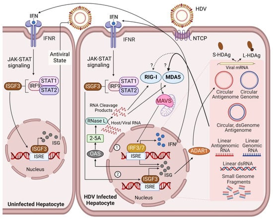 It is important to note that the establishment of the HDV life cycle requires one of the ISGs, adenosine deaminase acting on RNA 1 (ADAR1), which introduces a point mutation that eliminates the stop codon of S-HDAg, resulting in the addition of 19 amino acids to generate L-HDAg []. This event regulates the relative abundance of S- and L-HDAg, which are necessary for genome replication and virion assembly, respectively [,]. Hence, the HDV activation of the PRR signaling pathway and subsequent induction of ADAR1 might represent a viral immune evasion strategy. Taken together, the currently available evidence suggests that the HDV life cycle is maintained through a delicate balance between the exploitation of ISG induction machinery, the development of IFN refractoriness in infected hepatocytes, and its high resistance to the antiviral actions of ISGs.