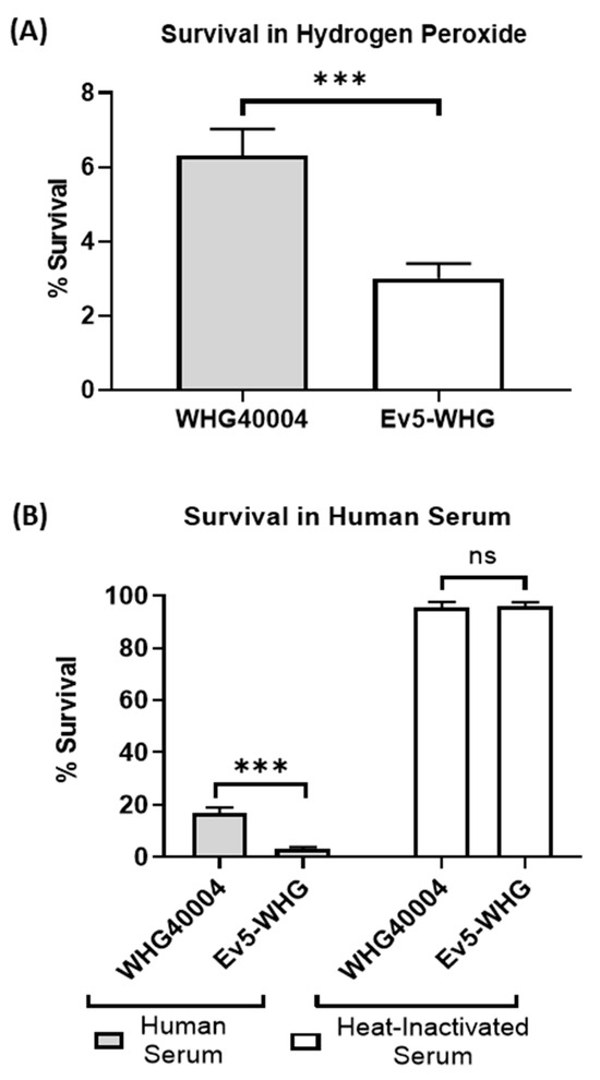 Performance in a host microenvironment. (A) Percentage of surviving bacteria following treatment with hydrogen peroxide. Data are expressed as mean ± SEM (n = 3). ***: p < 0.001; (B) Percentage of surviving bacteria in normal human serum. Data are expressed as mean ± SEM (n = 4). ***: p < 0.001; ns: not significant. Presented results are an average of 3 or more independent experiments.