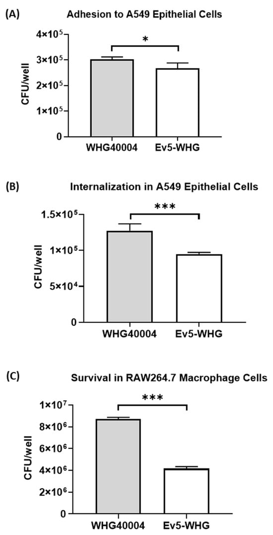 3.3. Ev5-WHG Displayed Impaired Adhesion and Invasion to A549 Epithelial Cells, and Decreased Resistance to Killing by RAW264.7 Macrophage Cells