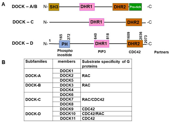 To date, 11 members of the DOCK protein family have been identified; these have been classified into four subgroups [5] based on sequence similarity, associated regulatory domains, and substrate specificity (Figure 1). The DOCK-A subgroup consists of DOCK1 (also known as DOCK180), DOCK2, and DOCK5; the DOCK-B subgroup includes DOCK3 (also known as PBP (presenilin binding partner) or MOCA (modifier of cell adhesion)) and DOCK4. Although the DOCK-A/B subgroups share similar structures, characterized by an amino-terminal SH3 domain capable of binding ELMO (engulfment and motility) adaptor proteins and a proline-rich carboxy-terminal domain that binds Crk proteins [6], their classification into DOCK-A and -B subfamilies was determined on the basis of their identity scores; these were obtained through ClustalW and phylogenetic analysis conducted using their sequences [7]. The DOCK-C subgroup comprises DOCK6, DOCK7, and DOCK8, also known as Zir (for Zizimin-related) 1, 2, and 3, respectively. Finally, the DOCK-D subgroup consists of DOCK9, DOCK10, and DOCK11, also known as Zizimin (Ziz) 1, 3, and 2, respectively, all of which possess an amino-terminal PH domain [8]. DOCK-A/B proteins act as exchange factors for the GTPase RAC, while DOCK-C proteins are considered dual-specificity GEFs for RAC and CDC42 [9]. Among the DOCK-D proteins, DOCK9 and DOCK11 exhibit a preference for interacting with CDC42, whereas DOCK10 interacts with both RAC and CDC42 [10,11].