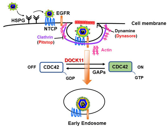 We previously observed that ablation of DOCK11 expression by shDOCK11 in PXB cells significantly suppressed HBV DNA and cccDNA levels [20]. Furthermore, when we used recombinant NanoLuc (NL)-HBV particles, which mimic the early stage of the HBV life cycle from entry to transcription/translation through cccDNA formation [35], we observed that the substantial increase in cccDNA-derived Luc activity resulting from DOCK11 overexpression was markedly repressed by the entry inhibitors Dynasore (an endocytosis inhibitor) and Pitstop 2 (a clathrin inhibitor). For HBV entry into host hepatocytes, it may be necessary for HBV particles to attach to susceptible cells through heparan sulfate proteoglycans (HSPGs) factors [36] and then bind to its receptors, sodium taurocholate cotransporting peptides (NTCPs), thus mediating HBV endocytosis [37]. The mechanism for endocytosis of epidermal growth factor receptor (EGFR) coordinates the transport of incoming hepatitis B virus to the endosomal network [38]. This step depends on cellular factors such as clathrin, caveolin-1, and dynamin-2. Notably, the actin cytoskeleton is essential for the formation and movement of clathrin-associated endocytic vesicles [39,40,41]. Thus, DOCK11 likely exerts its effects by modulating CDC42 GTPase activity, thereby inducing actin polymerization and subsequently promoting HBV endocytosis on the cell surface (Figure 2) [2].