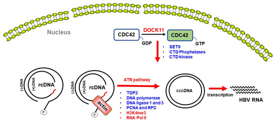 The proposed hypothesis explains the mechanism for the role of DOCK11 in HBV cccDNA formation and its modulation of histone modifications and RNA Pol II on HBV cccDNA. DOCK11 activates CDC42 to stimulate actin polymerization, thereby activating the ATR signaling pathway and facilitating cccDNA formation [25]. Additionally, DOCK11 triggers the CDC42-mediated pathway, regulating downstream molecules such as SET9 (a lysine methyltransferase), C-terminal domain (CTD) phosphatases, and CTD kinase to modulate H3K4 methylation and phosphorylation status within the RNA Pol IIA CTD, ultimately maintaining cccDNA [26].