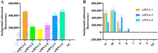 Screening of crRNAs. (A) Cleavage activity of CRISPR/Cas12a guided by six crRNAs targeting the HA gene of H5 viruses. (B) CRISPR/Cas12a reactions were performed with 10-fold serial dilutions of plasmid templates, and crRNAs with the highest fluorescence values after screening from crRNA-1, crRNA-5, and crRNA-6 were used for subsequent experiments. Fluorescence signals were read using QuantStudio software (Applied Biosystems, v1.4.3). (11~5: 9.57 × 1011 copies/µL~9.57 × 105 copies/µL.)
