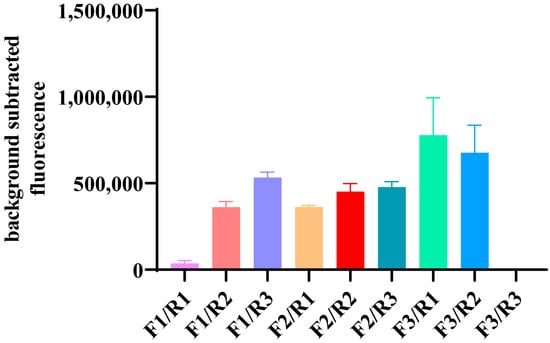 Since there is still no software to design primers for RPA, the amplification of the primers is critical to the detection efficiency. Then, we designed three pairs of primers to amplify the HA gene of H5 viruses after analyzing 988 HA sequences from Chinese H5 viruses. The RT-RPA assay was performed with RNA templates, which were extracted from a H5 virus A/Duck/GuangXi/1/2018 (H5N6), at a concentration of 60 ng/µL by a random combination of three forward primers and three reverse primers, respectively, and then the products were detected for CRISPR/Cas12a, and the pair of primers (F3/R1) with the highest fluorescence value was used for the subsequent assay (Figure 3).