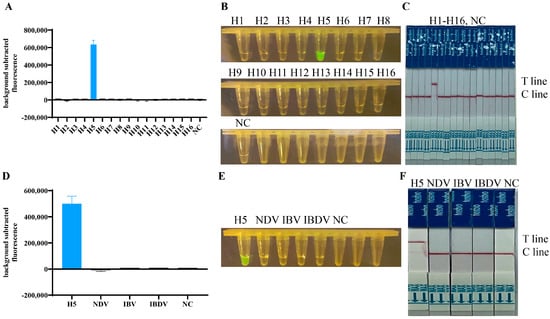 To evaluate the specificity of the established assay, a comprehensive panel of nucleic acids was tested, including all the H1-H16 subtypes of AIV, NDV, IBV, and IBDV. The selected primer pair, F3/R1, together with crRNA5, were used for this rigorous evaluation. Only H5 subtype AIV achieved noticeable fluorescence values (Figure 4A,D), showed color under blue light (Figure 4B,E), and a band on the Test line of the lateral flow strip (Figure 4C,F), which were not observed for the other subtypes of AIV, NDV, IBV, and IBDV. The findings indicated that this assay was uniquely selective for the H5 subtype of AIVs, and had no cross-reactivity with other AIV subtypes or the aforementioned avian viruses. The results demonstrated the exceptional specificity of our approach.