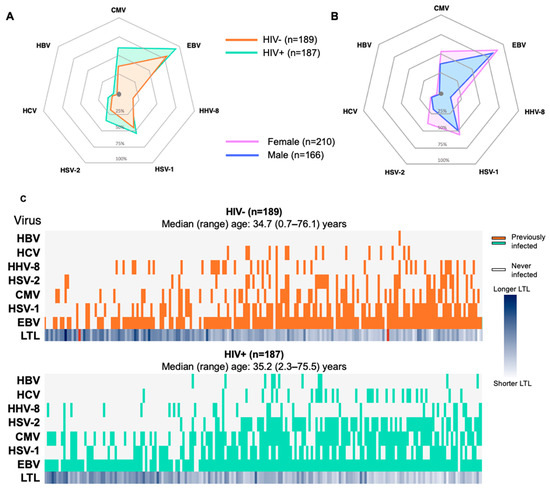 In this cross-sectional study, we sought to determine the seroprevalence of seven latent/chronic infections (HSV-1, HSV-2, EBV, CMV, HHV-8, HBV, and HCV) in a sample of male and female study participants living with HIV and not, distributed across the human lifespan, from <1 to 76 years. Given that harboring multiple chronic viruses and/or latent viruses can contribute to immunological aging, our aim was to also investigate the effect of sex and HIV status as predictors of viral infections and examine the associations between viruses and leukocyte telomere length (LTL).