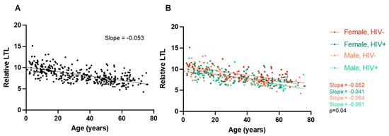 Amongst all participants, in the sex-segregated and HIV-segregated groups, we confirmed that relative LTL significantly decreases with advancing age (Figure 2). This result was expected and provides a baseline for the interpretation of further results.
