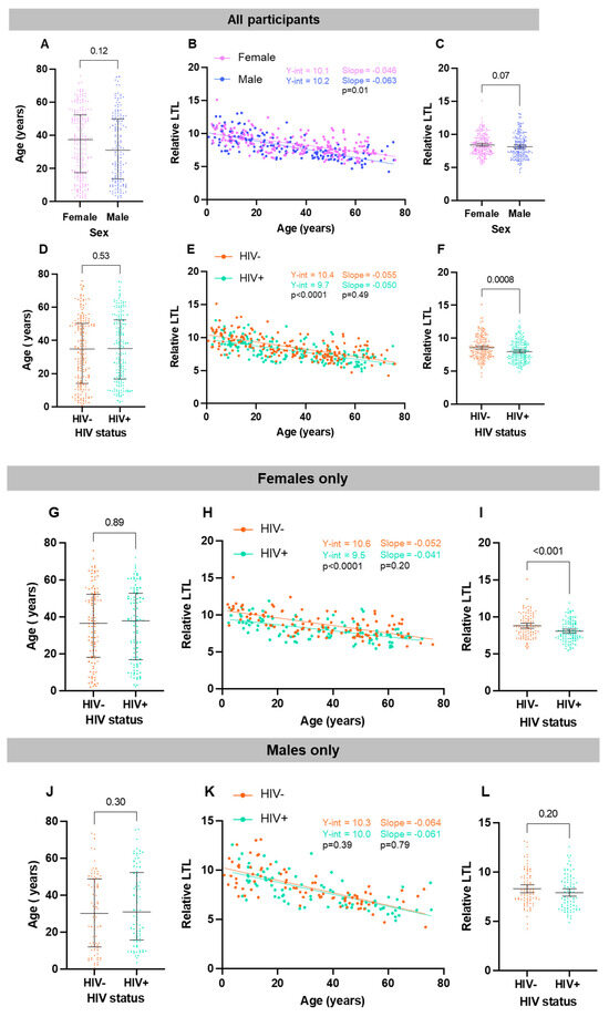 Relative LTL significantly decreases with older age in both female and male groups. (A) There is no significant difference in age between all male (n = 165) and all female participants (n = 209) (p = 0.12, Mann–Whitney test, median + IQR shown). (B) Scatterplot depicting all participants separated by sex. Increasing age is significantly associated with a shorter LTL amongst both female participants (Pearson r= −0.59, Pearson’s p < 0.0001) and male participants (r= −0.71, p < 0.0001). There is a significant difference in the slope of their regression lines, whereby LTL decreases at a steeper slope in male participants compared to female ones (p = 0.01). (C) There is no significant difference in LTL between male and female participants (p = 0.07, unpaired t-test, mean + 95% CI shown). Relative LTL significantly decreases with older age in both HIV+ and HIV- groups. (D) There is no significant difference in age between all HIV- (n = 187) and HIV+ (n = 187) participants (p = 0.53, Mann–Whitney test, median + IQR shown). (E) Scatterplot depicting all participants separated by HIV status. Increasing age is associated with a shorter LTL amongst both HIV- participants (r= −0.65, p < 0.0001) and HIV+ participants (r= −0.64, p < 0.0001). There is a significant difference in y-intercept (p < 0.0001) but not regression line slope (p = 0.49). (F) HIV+ participants have significantly shorter LTLs compared to HIV- participants (p = 0.008, unpaired t-test, mean + 95% CI shown). Relative LTL significantly decreases with older age in both HIV+ and HIV- female groups. (G) There is no significant difference in age between female HIV- (n = 104) and female HIV+ (n = 105) participants (p = 0.71, Mann–Whitney test, median + IQR shown). (H) Scatterplot depicting all female participants separated by HIV status. Increasing age is associated with a shorter LTL amongst both female HIV- participants (slope = −0.052, Pearson’s p < 0.0001) and female HIV+ participants (slope = −0.041, p < 0.0001). There is a significant difference in y-intercept (p < 0.0001) but not regression line slope (p = 0.20). (I) HIV+ female participants have significantly shorter LTLs compared to HIV- female participants (p = 0.0004, unpaired t-test, mean + 95% CI shown). Relative LTL significantly decreases with older age in both HIV+ and HIV- male groups. (J) There is no significant difference in age between male HIV- (n = 83) and male HIV+ (n = 82) participants (p = 0.30, Mann–Whitney test, median + IQR shown). (K) Scatterplot depicting all male participants separated by HIV status. Increasing age is associated with a shorter LTL amongst both male HIV- participants (slope = −0.064, p < 0.0001) and male HIV+ participants (slope = −0.061, p < 0.0001). There is no significant difference in y-intercept (p = 0.39) or regression line slope (p = 0.79). (L) There is no significant difference in LTL between male HIV- and male HIV+ participants (p = 0.20, unpaired t-test, mean + 95% CI shown).