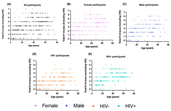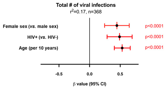 3.4. A Greater Number of Viruses Is Associated with Older Age, HIV Status, and Female Sex