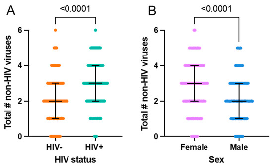 Number of non-HIV viruses according to HIV status and sex. (A) HIV+ participants have a significantly greater number of other viral infections compared to HIV- participants. Univariately, the HIV+ group has a greater number of non-HIV viruses (p < 0.0001); the median number of viruses is 2 amongst HIV- participants (n = 189) and 3 amongst HIV+ participants (n = 187). Median + IQR shown; Mann–Whitney test. (B) Female participants have a significantly greater number of non-HIV viral infections compared to male participants. Univariately, the female group has a greater number of non-HIV viruses (p < 0.0001); the median number of viruses is 3 for the female group (n = 210) and 2 for the male group (n = 166). Median + IQR shown; Mann–Whitney test.