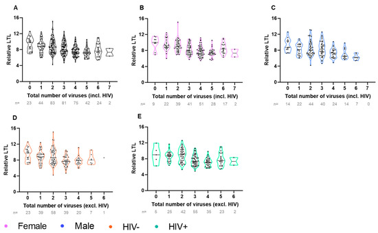 LTL decreases as the total number of viral infections increase. Violin plot depicting relative LTL univariately decreasing as the total number of viral infections increases in (A) all participants (n = 374, Spearman’s rho = −0.36, p < 0.0001), and amongst (B) only female participants (n = 209, rho = −0.40, p < 0.0001), (C) only male participants (n = 165, rho = −0.37, p < 0.0001), (D) only HIV- participants (n = 187, Spearman’s rho = −0.31, p < 0.0001), and (E) only PLWH (n = 187, Spearman’s rho = −0.34, p < 0.0001).