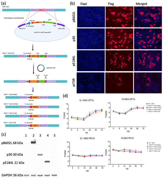 Construction and characterization of ORFV recombinants. (a) Schematic representation of homologous recombination between plasmid pUC57-I1L-ASFV-loxp-eGFP and ORFV-IA82 genome. The recombinant viruses were passed in Cre recombinase-expressing cells for GFP removal. (b) Immunofluorescence assay performed in OFTu cells infected with different ORFV recombinants. Cells were fixed and incubated with monoclonal mouse Anti-FLAG® M2 antibody, followed by incubation with goat anti-mouse IgG secondary antibody (Alexa Fluor® 594 conjugate). Nuclear staining was performed with the DNA-specific stain DAPI. (c) Western blot assay performed in OFTu cells infected with ORFV-IA82 (1), ORFV-∆121-ASFV-B602L (2), ORFV-∆121-ASFV-CP204L (3), ORFV-∆121-ASFV-E184L (4), and ORFV-∆121-ASFV-I73R (5); GAPDH was used as the loading control. One hundred micrograms of whole-cell lysate was resolved by SDS-PAGE in 10% acrylamide gel and transferred to a nitrocellulose membrane, probed with monoclonal mouse Anti-FLAG® M2 antibody and Proteintech Rabbit GAPDH antibody, followed by IRDye® 800CW Mouse IgG Secondary antibody and IRDye® 680RD Rabbit IgG Secondary antibody. (d) Single-step (0.1 MOI) and multi-step (10 MOI) growth curves of ORFV recombinants. OFTu and PK15 cells were infected and virus titers were collected at 0, 6, 12, 24, 48, and 72 h post-infection. The virus titers were determined by Spearman and Karber’s method and expressed as tissue culture infection dose 50 per mL (TCID50/mL).