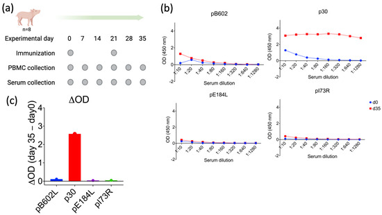 The antibody responses elicited against ASFV pB602L, p30, pE184L, and pI73R were evaluated using ELISA assays following the immunization of pigs with the ORFV∆121ASFV-B602L, -CP204L, -E184L, and -I73R recombinant viruses. Pooled serum samples collected on day 0 and 35 p.im. (Study 1, Figure 3a) were tested against recombinant purified ASFV pB602L, p30, pE184L, and pI73R proteins using ELISAs. As shown in Figure 3b, while only low antibody binding was detected against ASFV-pB602L, pE184L, and pI73R, robust antibody binding was detected against ASFV p30, as evidenced by a high ΔOD between day 35 and day 0 p.im. (OD day 35–OD day 0) (Figure 3c). The dynamics of antibody responses against p30 in ORFV∆121ASFV-immunized pigs were also evaluated by ELISA, using serum samples from individual animals in Study 1. As shown in Figure 4a,b, increasing p30 antibody titers were detected starting on day 14 p.im., with a robust and anamnestic antibody response being detected on day 28 p.im. (a week after the booster immunization on day 21, Study 1) (Figure 4b).