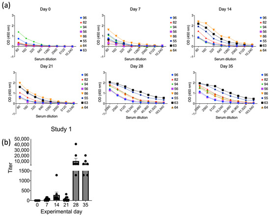Purified recombinant ASFV pB602L, -p30, -pE184L, and -pI73R proteins were obtained by immunoprecipitation, as described above. Each protein was coated into Immunolon 1B polystyrene microtiter plates (Thermo Fisher Scientific, Waltham, WA, USA) at a concentration of 25 µg/mL in carbonate–bicarbonate solution (100 mM, pH 9.6) and incubated for 1 h at 37 °C. Following coating, the plates were washed three times with 300 µL of PBS and 0.05% Tween 20 per well. Blocking solution (1X PBS, 0.05% Tween 20, and 5% non-fat dry milk) was added to all wells, and the plates were placed at 4 °C overnight. The next day, the plates were washed three times, as above. Serial 2- or 3-fold dilutions of polled serum collected on days 0 and 35 p.im. (Study 1) or 0 and 42 p.im (Study 2) were diluted in blocking solution and added to coated and uncoated control wells (100 µL/well). Plates were incubated at RT for 1 h and washed three times, as described above. Goat Anti-Pig IgG-Fc fragment biotinylated antibody (Bethyl—Fortis Life Sciences, Waltham, WA, USA) diluted 1:4000 in blocking buffer was added to all wells (100 µL/well). Plates were incubated at 37 °C for 1 h and washed three times, as above. Pierce™ High Sensitivity Streptavidin-HRP (Thermo Fisher Scientific, Waltham, WA, USA) was diluted 1:4000 in blocking buffer and added to all wells (100 µL/well). Plates were incubated at 37 °C for 1 h and washed three times. Reactions were developed using TMB peroxidase substrate (SeraCare, Milford, MA, USA), and OD values were read at 450 nm, using the Synergy LX microplate reader (BioTek Instruments, Charlotte, VT, USA).