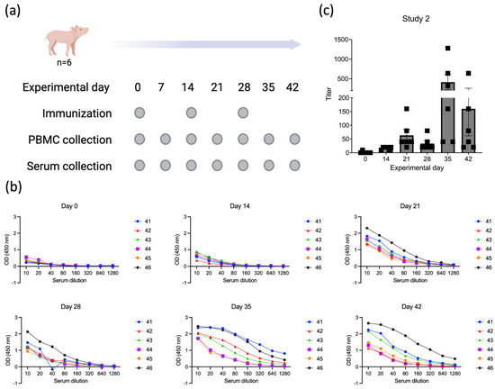 To confirm the immunogenicity of p30, we performed a second immunization study (Study 2, Figure 5a) in which six four-week-old piglets were immunized only with the recombinant ORFV∆121ASFV-CP204L. Prime immunization was performed on day 0, and boosters were given on days 14 and 28 p.im. Serum samples were collected on days 0, 14, 21, 28, 35, and 42 p.im. Similar to what we observed in Study 1, all animals in Study 2 started showing detectable antibody titers against p30 on day 14 p.im. (Figure 5b,c). As expected, an increase in antibody titers was observed on day 21 p.im. following the booster on day 14. An anamnestic antibody titer increase was observed on day 35 p.im., following the second booster immunization on day 28 (Figure 5b,c).