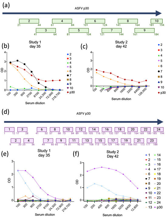 Identification of B-cell epitopes of ASFV p30. (a) The full-length ASFV p30 amino acid sequence was divided into peptides of 24 amino acids of length, with the last four amino acids overlapping the next peptide. (b) Antibodies against each peptide in serum from piglets collected at 35 dpi (Study 1) and (c) 42 dpi (Study 2). (d) The full-length ASFV p30 was further divided into peptides of 12 amino acids of length, with the last four amino acids overlapping the next peptide. (e) Pepscan ELISA detecting antibodies against each peptide in serum from piglets collected at day 35 p.im. (Study 1) and (f) day 42 p.im. (Study 2).