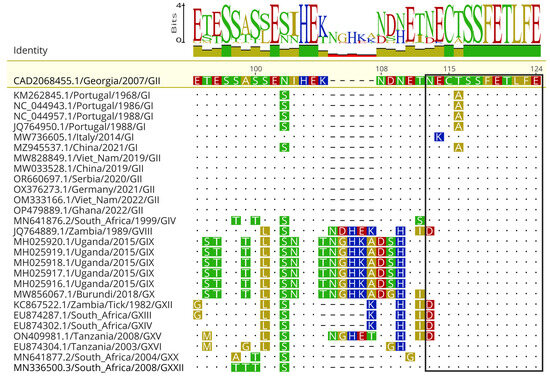 A comparative sequence analysis was performed with ASFV p30 sequences available on GenBank (n = 526, as of 12 January 2024) to determine the overall conservation of the full-length protein and of the immunodominant Ep15 between distinct ASFV genotypes. Overall, the amino acid sequence identity among complete p30 sequences ranged from 86 to 100%. There is a five amino acid HEKND insertion at position 104 in GVIII and GXV, and a HETNG insertion in the same position in GIX and GX; however, this insertion is not present in GI, GII, GIV, GXII, GXIII, and GXIV (Figure 7). The intragenotypic sequence identity of complete p30 sequences was 99–100%. Notably, the region comprising Ep15 (113-NECTSSFETLFE-124) was highly conserved (100%) among GII, GIX, and GX isolates (Figure 7), while a N113D substitution was observed in GVIII, GXIII, GXIV, and GXV ASFV isolates; and a T116A substitution was observed in contemporary and historical GI viruses (Figure 7). There are five additional sequences of “low-virulence ASFV” in the GenBank (GenBank accession KM262845.1, NC_044943.1, NC_044957.1, JQ764950.1, and MZ945537.1) with T116A substitution in Ep15 [49]. Another GI isolate (GenBank accession MW736605.1) has a E114K substitution (Figure 7).