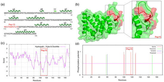 The p30 protein comprises eight α-helices designated αA-αH (Figure 8a). Notably, it harbors a highly flexible loop from amino acid residues Phe91 to Ser135, between the αE and αF secondary structures (Figure 8b). Our in silico analysis revealed that the immunogenic Ep15 identified as an immunodominant B-cell epitope within p30 is located in the flexible loop region (Figure 8b). The loop region of p30, especially the Ep15 amino acid residues, is predicted to exhibit a highly hydrophilic nature, enriched with charged aminos that are likely to be exposed on the surface of the protein (Figure 8c). The Ep15 contains putative phosphorylation sites, with Ser117 residues having the highest predicted score (0.990) (Figure 8d).