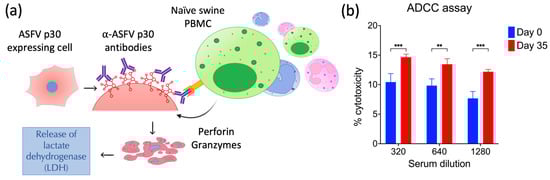 Antibodies against ASFV p30 elicit antibody-dependent cell cytotoxicity. (a) ADCC representation: Antibodies bind to p30 expressed on the cell surface. The Fc portion of the antibodies is recognized by the Fc receptor of cytotoxic lymphocytes (e.g., natural killer cells), which trigger the release of perforins and other enzymes that lead to the death of the target cell. (b) Analysis of ADCC through measure of lactate dehydrogenase in the supernatant of cells overexpressing ASFV p30 incubated with serum from 0 dpi and 35 dpi and overlaid with naïve swine PBMC. ** p < 0.001; *** p < 0.0001.